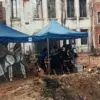 Extras posing with false heads that were blown up for special effects