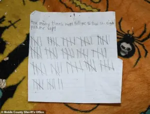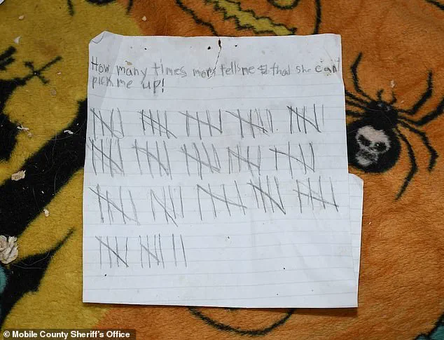 The girl’s letter, with its 87 tally marks, became a chilling artifact of her mother’s repeated excuses—each one a lie that had left her stranded in a world of filth and abandonment.