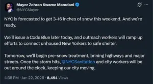 He also announced that outreach workers are ramping up efforts to connect unhoused residents with safe shelter, while urging New Yorkers to sign up for emergency notifications. “Stay warm.
